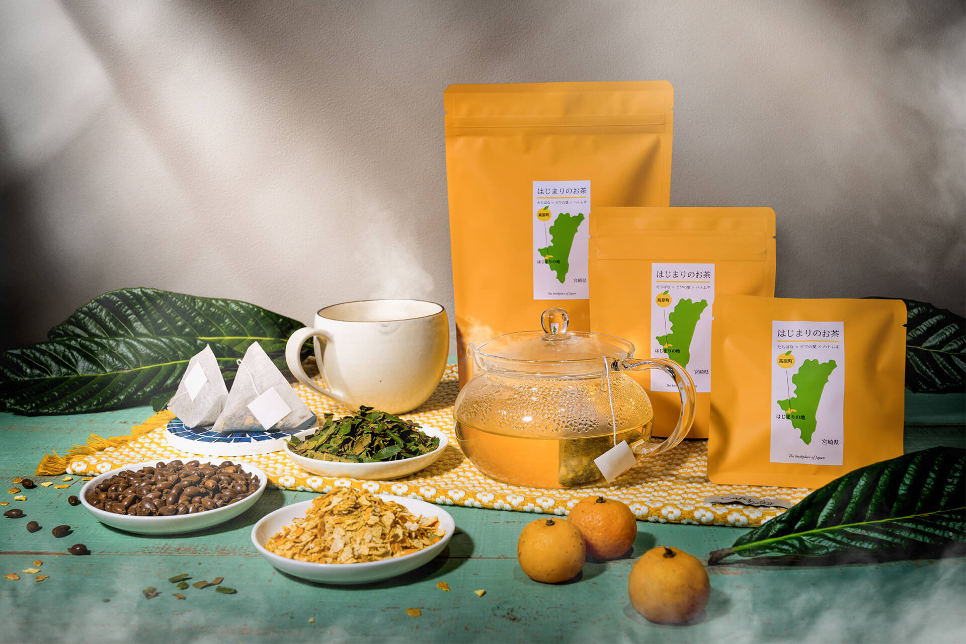 「はじまりのお茶」は宮崎県高原町の町木「たちばな」を使ったブレンド茶です。「たちばな」は古事記や日本書紀にも登場する由緒ある果実で、不老不死や永遠を象徴する果実として日本文化に深く根付いています。また、ここ高原町は神武天皇ご生誕の地と伝えられ、この地から日本が始まったとされることから、このお茶を「はじまりのお茶」と名付けました。悠久の歴史を刻む高原町で、永遠を象徴するたちばなの香りと味わいをお楽しみください。
